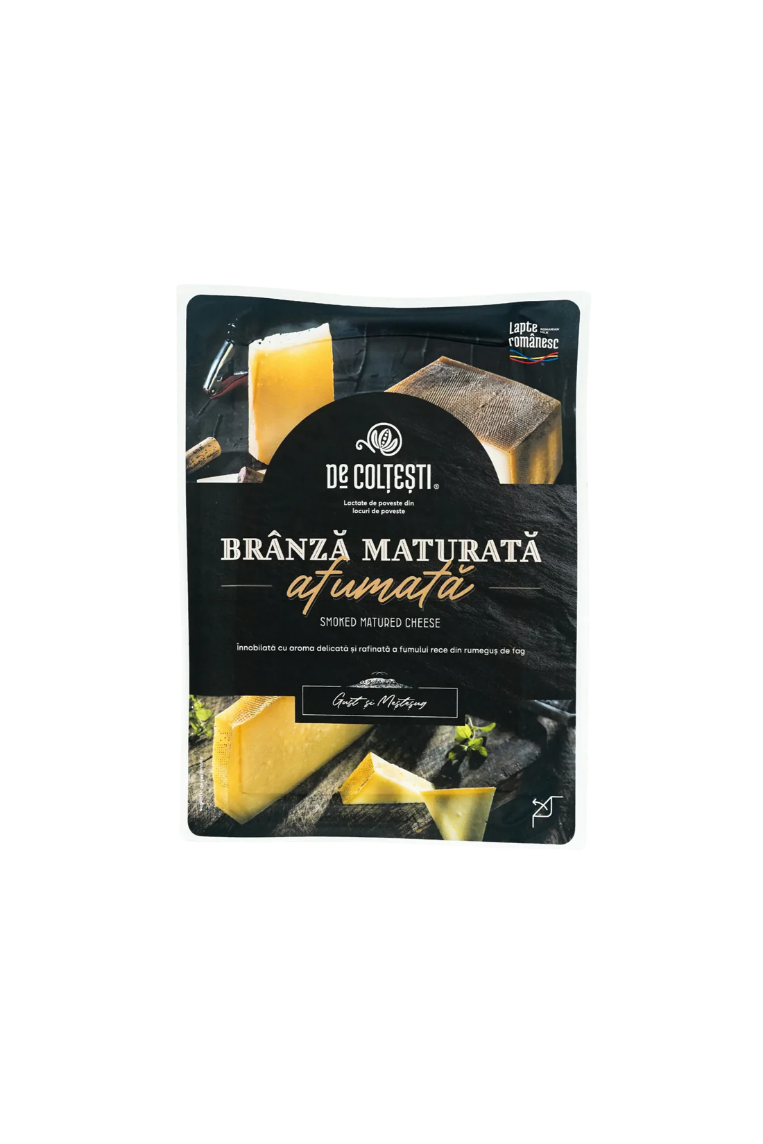 Brânza maturată afumată, bazată pe brânza de tip Gouda, are un gust bogat și complex, caracterizat prin aroma afumată care îi conferă un plus de savoare. Este adesea folosită în diverse preparate culinare sau savurată pur și simplu alături de pâine, fructe sau vin. Procesul de afumare adaugă nu doar un gust distinct, ci și o textură interesantă, făcând-o o alegere populară în rândul iubitorilor de brânzeturi