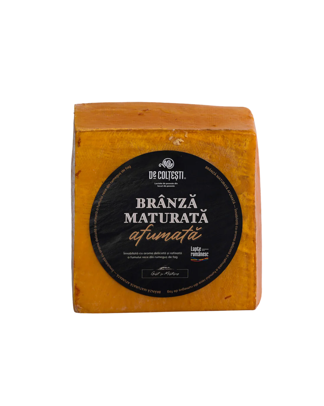 Brânza maturată afumată, bazată pe brânza de tip Gouda, are un gust bogat și complex, caracterizat prin aroma afumată care îi conferă un plus de savoare. Este adesea folosită în diverse preparate culinare sau savurată pur și simplu alături de pâine, fructe sau vin. Procesul de afumare adaugă nu doar un gust distinct, ci și o textură interesantă, făcând-o o alegere populară în rândul iubitorilor de brânzeturi