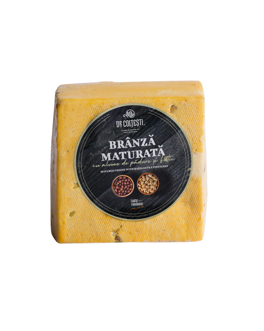 Brânză maturată cu fistic și alune – un deliciu cu personalitate, ce îmbină cremozitatea intensă a brânzei cu aroma bogată și textura crocantă a oleaginoaselor. Fisticul adaugă o notă fină, ușor dulceagă, iar alunele desăvârșesc profilul gustativ cu accente prăjite subtile. Perfectă pentru platourile gourmet, gustări creative sau reinterpretarea unor rețete clasice, această brânză transformă fiecare moment într-o experiență culinară memorabilă.