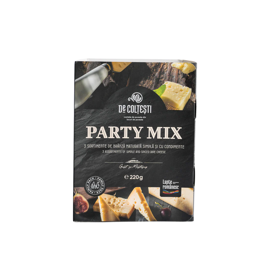 Party Mix este o selecție delicioasă de 3 tipuri de brânză maturată, atât simplă, cât și cu condimente, tăiată în cubulețe perfecte pentru gustări.