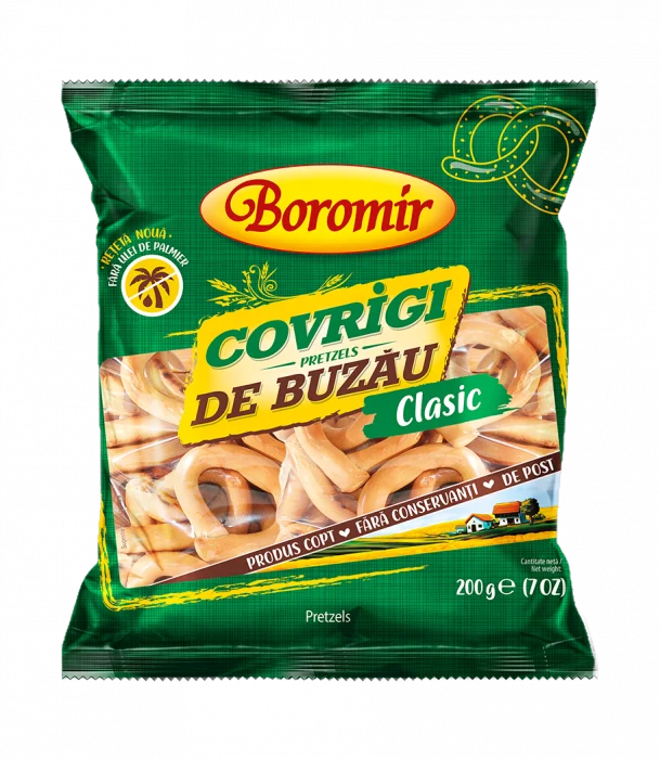 Covrigii de Buzău clasici Boromir îți aduc mai aproape gustul autentic al covrigilor preparați după o rețetă tradițională buzoiană pentru a conferi mai multă savoare momentelor în vrei să te răsfeți cu o gustare ușoară. Din câteva ingrediente simple, dar atent selecționate, se obțin cei mai buni Covrigi de Buzău. În prepararea lor nu se folosesc conservanți, ci doar ingrediente naturale astfel încât să te bucuri de snack sănătos și gustos. Merge să-i servești alături de un sos dulce de muștar și miere sau de o cremă de unt de arahide și ciocolată. Află de pe blogul nostru cum prepari din ei gustările sănătoase perfecte serile de relaxare și distracție. Tot pe blog găsești și alte idei inedite de servire pe care le vei adora. Descoperă în Colecția Boromir mai multe sortimente pe care să le împarți cu cei dragi.