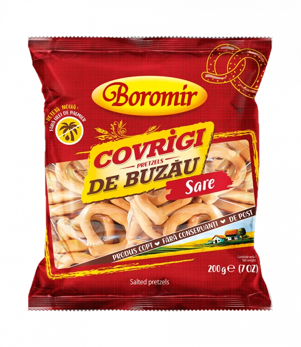 Covrigii de Buzău cu sare Boromir sunt concepuți după o rețetă tradițională buzoiană astfel încât să îți ofere o experiență autentică de fiecare dată. Crocanți și gustoși, Covrigii Boromir cu sare sunt preparați din ingrediente naturale, atent selecționate pentru ca tu să te bucuri de o gustare fără conservanți, pe cât de delicioasă, pe atât de sănătoasă. Sunt perfecți pentru orice moment al zilei, încântându-te de fiecare dată cu gustul lor unic. Merg de minune serviți alături de o cremă fină de brânză sau un sos picant de salsa, maioneză, pesto sau muștar. Pe blogul nostru vei găsi mai multe idei de servire complet inedite. Și cum Covrigii de Buzău duc mai departe tradiția frumoasă a colindeților oferiți în dar cu ocazia sărbătorilor de iarnă, ți-am pregătit pe blog și un articol minunat despre mersul cu colinda. Descoperă mai multe sortimente de covrigi pe care să-i împarți cu cei dragi.