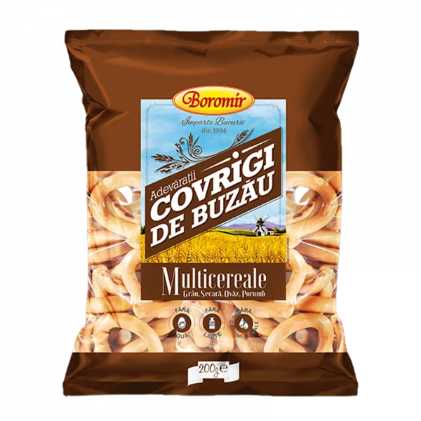 Covrigii de Buzău Boromir cu multicereale au fost special concepuți după o rețetă tradițională buzoiană astfel încât să te bucuri de gustul deosebit al covrigilor tradiționali de Buzău. Preparați cu făină de ovăz, făină de secară și mălai, Covrigii Boromir cu multicereale sunt o gustare hrănitoare, numai bună de savurat în orice moment al zilei. Sănătoase și gustoase, ronțăielile de la Boromir completează perfect platourile cu snacks-uri pentru petreceri. Ii poți servi cu fasole bătută, hummus sau un sos de avocado. Găsești pe blogul nostru fel și fel de rețete delicioase cu covrigi pentru diferite ocazii. În preajma sărbătorilor de iarnă, Covrigii de Buzău duc mai departe tradiția colindeților oferiți în dar, fiind numai buni de împărțit colindătorilor.
