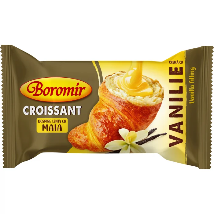 Croissantul Boromir îți aduce zâmbetul pe buze cu miezul pufos, bogat în cremă fină cu vanilie. Este preparat din ingrediente atent selecționate, prin dospire lentă cu maia naturală. Te poți bucura de gustul său unic oriunde și oricând vrei o gustare delicioasă.