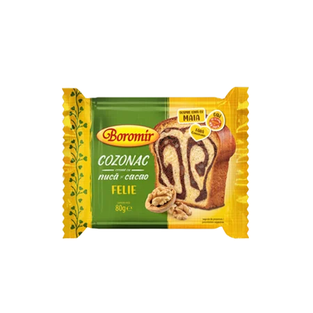 felie cozonac boromir cu cremă nucă și cacao 80gFelie Cozonac Boromir cu cremă nucă și cacao 80g