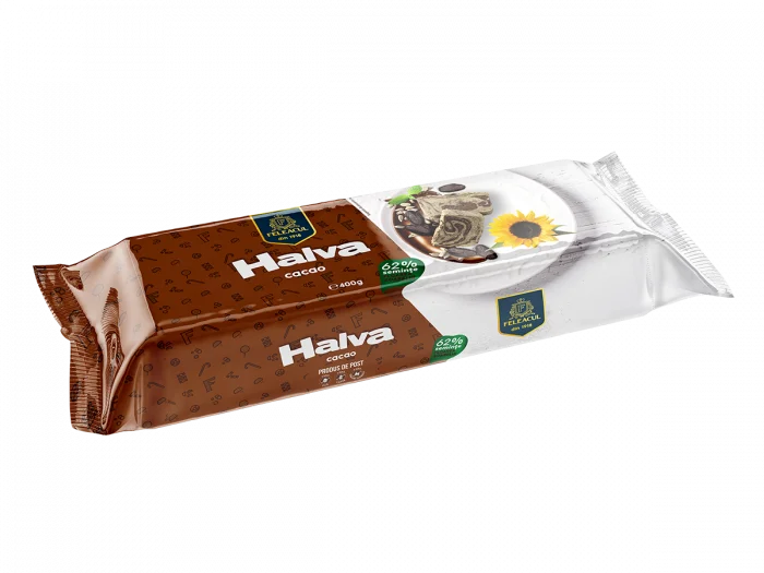 Un desert minunat ce amintește de copilărie, Halvaua Feleacul cu cacao promite clipe dulci pline savoare. Conținutul de 55% semințe de floarea soarelui o transformă într-o gustare delicioasă și bogată în fibre. Halvaua cu cacao merge savurată de minune și în zilele post în care vrei să te răsfeți cu ceva dulce. Preparate după rețetele tradiționale din ingrediente de cea mai bună calitate, dulciurile Feleacul îți aduc mai aproape gusturile românești, astfel încât să ai parte de o experiență de neprețuit.
