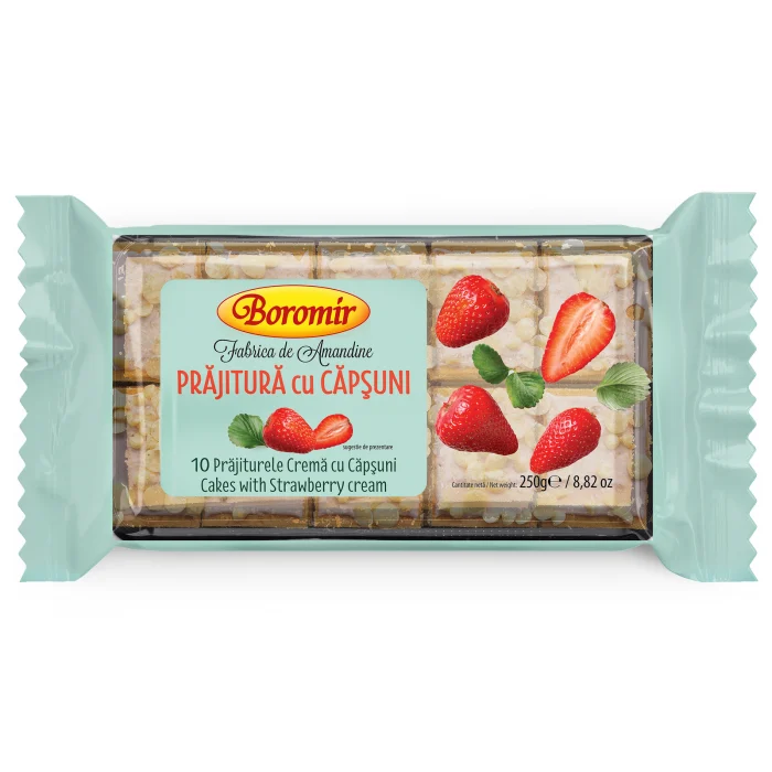 Ingrediente Prăjitură Boromir cu 30% cremă cu căpșuni: sirop de zahăr invertit, făină albă de grâu, zahăr, ouă, glucoză, uleiuri vegetale (palmier, floarea soarelui), amidon de porumb, dextroză, lapte praf, pastă de căpșuni 1,5% [sirop de glucoză, sirop de zahăr invertit, căpșuni 20%, acidifiant: acid citric, concentrate ( morcov negru, morcov), alcool etilic, amidon, aromă, suc concentrat de căpșuni], apă, unt de cacao, emulgatori: mono și digliceride ale acizilor grași, lecitină de soia, E470a, alcool etilic, zer pudră, agenți de afânare: bicarbonat de sodiu, bicarbonat de amoniu, sare iodată, arome, conservant: sorbat de potasiu. Produsul poate conține urme de nucă, arahide.