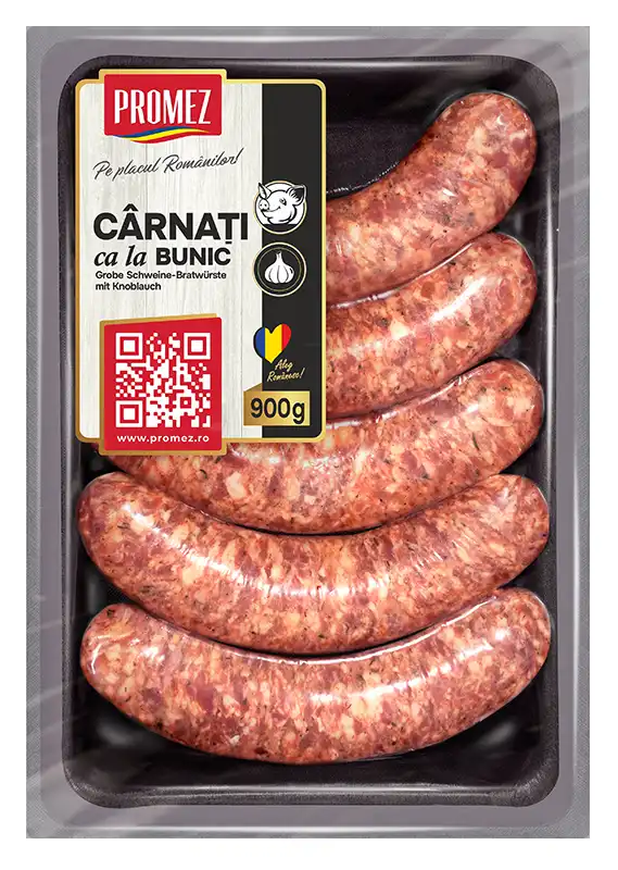 Carne de porc (68%), apă, slănină, sare, condimente naturale (usturoi granule, piper negru măcinat, boia dulce), conservant (acetat de sodiu), antioxidant (acid ascorbic). Membrană naturală (porc).