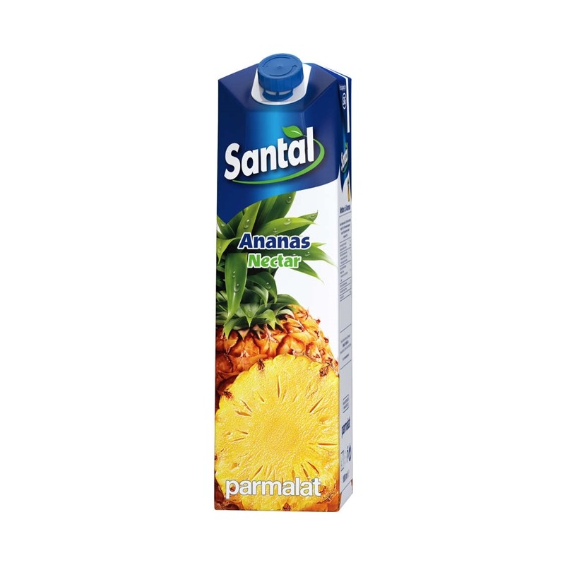 Nectar de ananas Santal cu continut minim de fruct 50%. Sucurile Santal din gama Nectar au o consistenta ridicata, sunt obtinute din piureuri si sucuri de fructe, adaos de apa, zahar si acizi alimentari, fara adaos de conservanti, coloranti si arome sintetice.